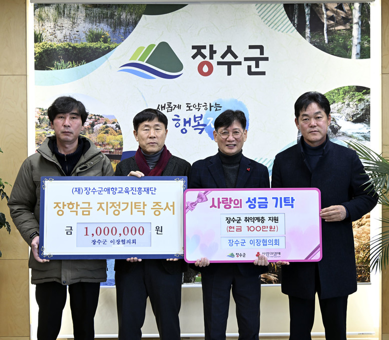 장수군 이장협의회(회장 송동훈)는 17일 군청에 방문해 지역 교육 발전을 위한 장학금과 어려운 이웃을 위한 성금을 각 100만원씩 총 200만원을 기탁했다.