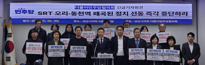 | ▲더불어민주당 'SRT 오리-동천역 왜곡된 정치 선동 즉각 중단하라' 긴급기자회견 모습.(사진=성남시의회 더불어민주당협의회) |