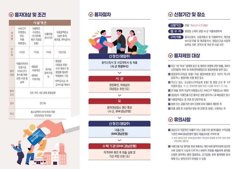 융자 희망자는 신청서 등 구비서류를 작성하여 영업장 소재 관할 시군 식품위생부서에 신청하면 되고, 이후 BNK경남은행의 대출 심사를 거친 후 최종 대상자로 선정되면 연 2%의 금리로 융자금*을 지원받을 수 있다.