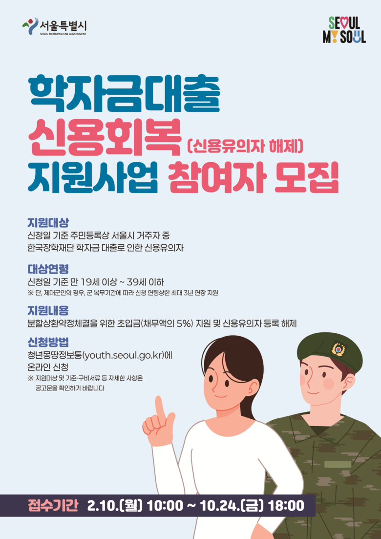 학자금대출 신용회복 지원이 필요한 서울 거주 청년은 10월 24일(금) 오후 6시까지 청년 몽땅 정보통(https://youth.seoul.go.kr)에서 별도 서류 제출 없이 온라인으로 신청하면 된다. 다만, 40~42세 의무복무 제대군인은 병역 기간이 자동으로 확인되지 않는 경우 병적증명서 또는 주민등록초본을 별도로 제출하여야 한다. 병역 기간 자동 확인 여부는 신청 시 페이지에 표시된다.