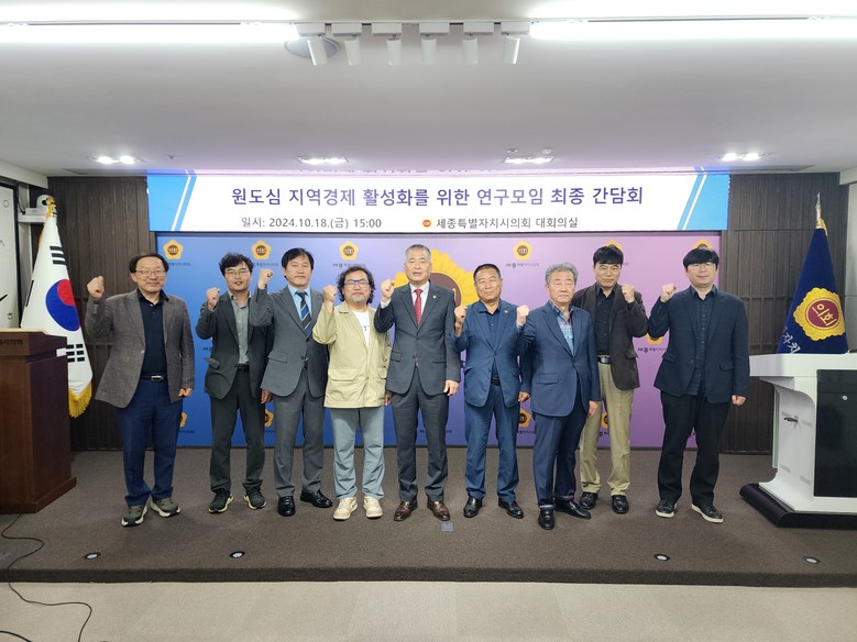 [세종 세계타임즈=이채봉 기자] 세종특별자치시의회(의장 임채성)는 18일 의회청사 대회의실에서 ‘원도심 지역경제 활성화를 위한 연구모임(대표의원 김충식)’의 제5차 간담회를 개최, 연구용역 최종 결과보고회를 끝으로 약 4개월간의 연구모임 활동을 마무리했다.