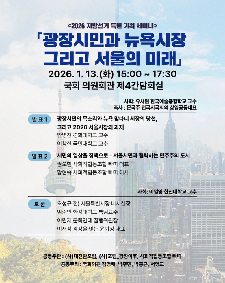 주관 측은 이번 논의가 서울시에서 벌어지는 ‘개발 경쟁’ 중심의 도시 담론을 넘어, 주거·생계·돌봄·이동·불평등 등 생활세계의 변화를 만드는 정책 경쟁으로 서울시장 선거의 의제를 전환하는 계기가 되길 기대한다고 밝혔다.
