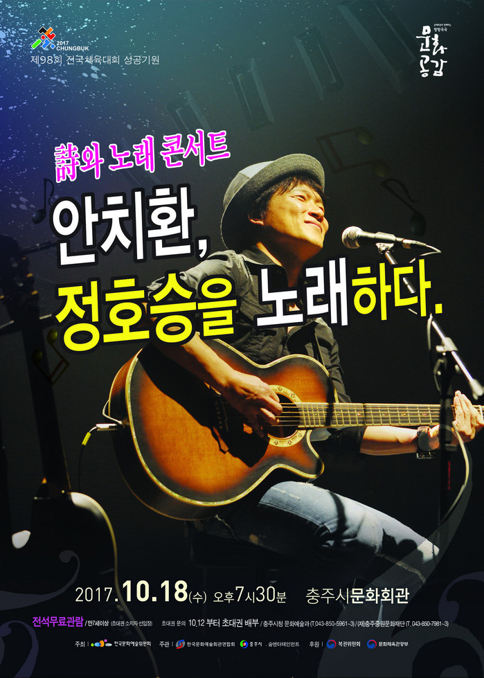 전국체전 문화행사인 중원문화대제전의 일환으로 이날 저녁 7시 30분부터 충주시문화회관에서 열리는 이번 공연은 ‘안치환, 정호승을 노래하다’를 주제로 전석 무료로 진행된다.