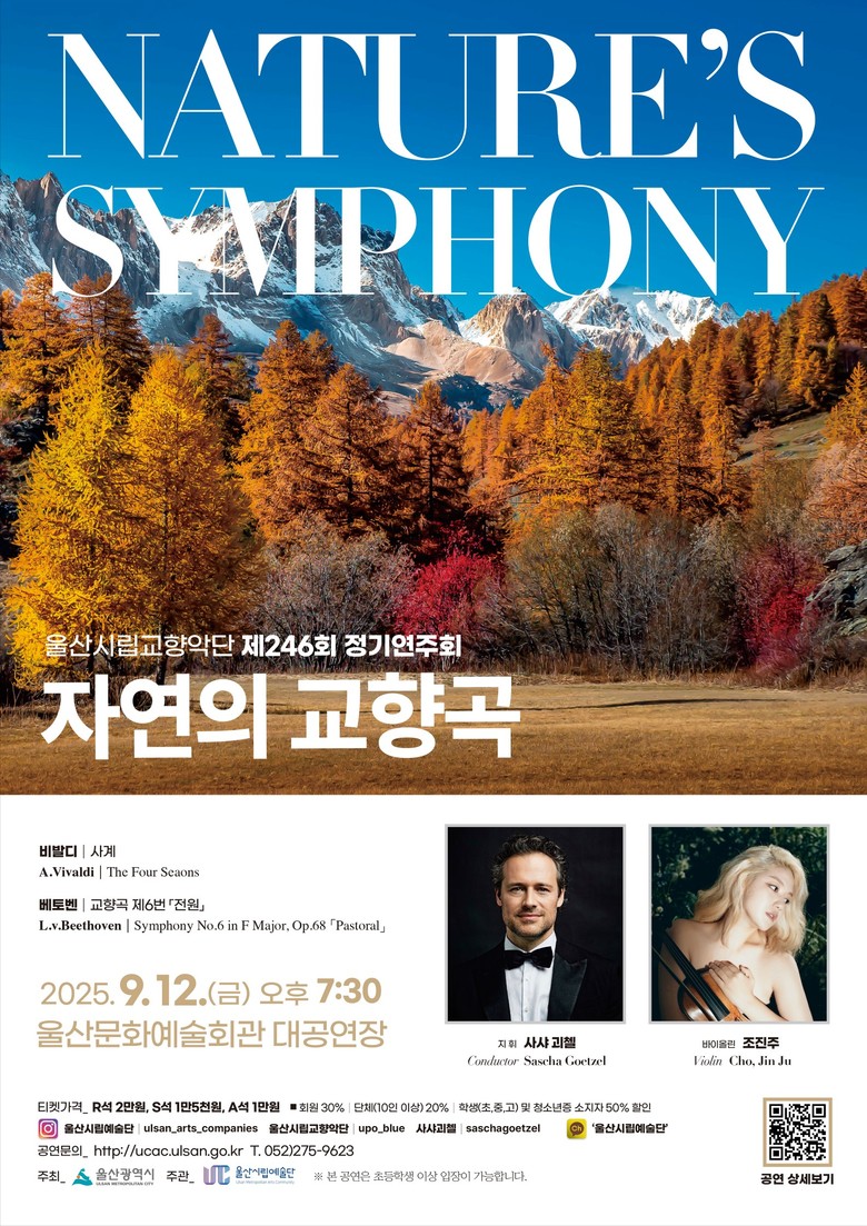 울산시립예술단 관계자는 “비발디 ‘사계’와 베토벤의 ‘전원 교향곡’은 모두 자연을 음악으로 형상화한 걸작으로, 이번 공연을 통해 계절과 풍경, 그리고 인간 감정이 어우러진 특별한 무대를 만날 수 있을 것”이라면서 “세계적 명성의 사샤 괴첼과 조진주가 선사하는 이번 「자연의 교향곡」에 시민 여러분의 많은 관심과 참여를 바란다”라고 말했다.