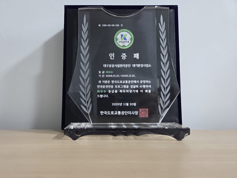 ▸ 안전운전 교육·캠페인 지속 추진으로 안전 문화 확산 [세계타임즈=대구 한윤석 기자] 대구공공시설관리공단(이사장 문기봉) 대기환경사업소는 지난 20일 한국도로교통공단에서 시행된 ‘안전운전인증’ 심의 결과, 11월 26일(수) 최우수 등급으로 인정받았다.