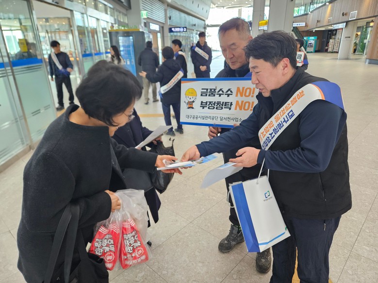 달서천사업처 직원들은 서대구역을 이용하는 시민들을 대상으로 ▲‘부정청탁·특혜제공·온정주의 No, Thank You’ ▲‘청렴한 대구, 깨끗한 대구, 안전한 대구, 대구공공시설관리공단이 앞장서겠습니다’ 등의 청렴 슬로건을 홍보했다. 또한 청렴 홍보 기념품을 배부하며 청렴 메시지를 전달하고 공단의 청렴 실천 의지를 알렸다.