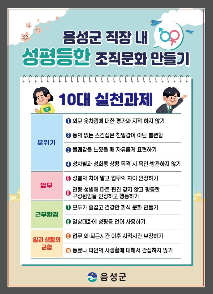 조병옥 음성군수는 “직원들의 자발적 참여를 유도하고 다양한 의견을 수렴해 세대와 성별 간 갈등 없이 함께 일하기 좋은 직장을 위한 성평등 조직문화가 정착될 수 있도록 적극 노력하겠다”며 “성평등 조직문화가 지역사회로까지 확산될 수 있도록 다양한 시책을 발굴하겠다”고 말했다.