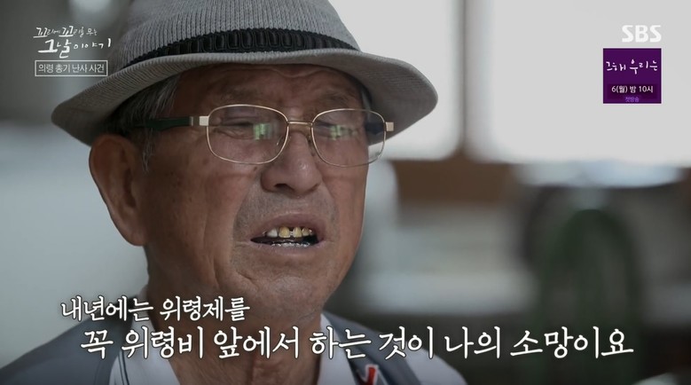 박상출 노인회장이 면민을 대표에 감사패를 전했고 위령제 때 연신 허리를 숙이며 오태완 군수에게 고맙다 흐느낀 유족 배병순 할머니는 이날만큼은 꽃다발을 전달하며 환하게 웃었다.