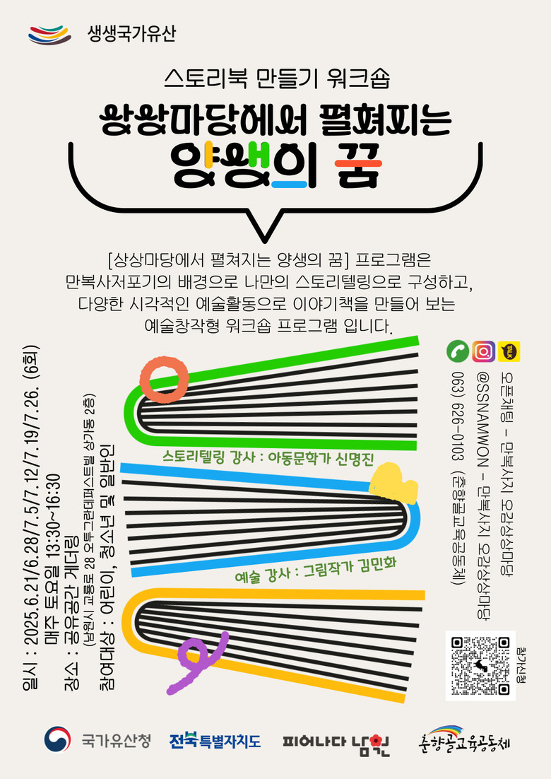『상상마당에서 펼쳐지는 양생의 꿈』 은 6월 21일 1회로 시작하여, 6월 28일(2회), 7월 5일(3회), 7월 12일(4회), 7월 19일(5회), 7월 26일(6회)로 총6회로 진행 될 예정이다. 본 행사는 국가유산청, 전북특별자치도, 남원시가 주최하고, 춘향골교육공동체가 주관하며, 참가신청은 춘향골교육공동체 홍보담당(063-626-0103)에게 신청 할 수 있다.