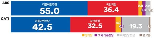 ARS 조사 결과를 살펴보면, ‘더불어민주당’은 전주 대비 3.5%p 오른 55.0%, ‘국민의힘’은 0.7%p 내린 36.4%를 기록하였다. (‘정의당’2.8%, ‘그 외 다른 정당’ 2.3%, ‘지지 정당 없음’ 3.2%, ‘모름/무응답’ 0.3%). 지역별로는 인천·경기, 대전·세종·충청, 강원·제주 지역은 더불어민주당 지지율 상승과 국민의힘 지지율 하락으로 더불어민주당 우세 속 양당 간 격차는 더욱 벌어졌다.