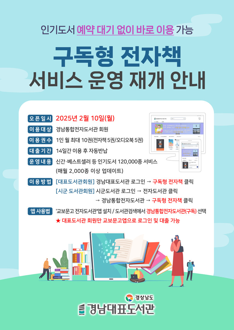 - 경남통합전자도서관 회원이면 누구나 1인 월 10권, 14일간 이용 [세계타임즈=경남 최성룡 기자] 경남대표도서관(관장 신민철)은 경남도민이면 누구나 지역과 상관없이 언제든지 온라인에서 도서를 대출할 수 있는 ‘2025년 구독형 전자책 서비스’를 오는 2월 10일부터 본격 운영한다고 밝혔다.