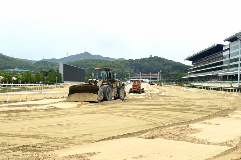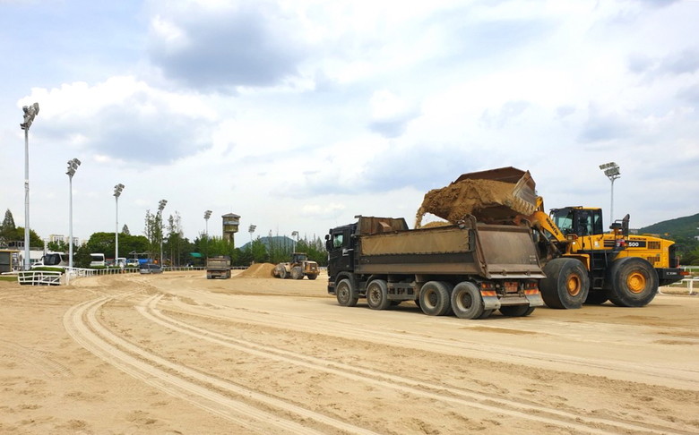 [세계타임즈 = 심하린 기자] 지난 24일과 25일 한국마사회(회장 정기환) 렛츠런파크 서울 경주로에 40여대의 중장비들이 4,000톤에 달하는 모래를 퍼 나르며 작은 사막을 방불케 하는 경주로 모래교체 작업이 진행됐다. 한국마사회는 안정적인 경마 시행과 경주마의 부상방지를 위해 매년 경주로 전체 모래를 수거하고 세척하여 재포설하는 작업을 진행한다.