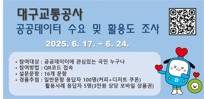 공공데이터에 관심 있는 시민은 누구든지 공사 홈페이지와 공식 SNS 채널의 팝업존 또는 QR코드를 통해 설문에 참여할 수 있다. 공사는 이번 설문조사를 통해 수렴된 시민 의견을 향후 공공데이터 운영 정책에 적극 반영할 계획이다.