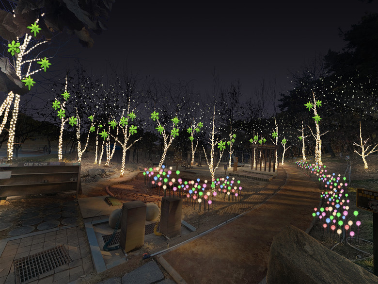 천년숲 산책로에는 은하수 조명과 녹색 별·눈 결정 오브제, 눈이 내리는 듯한 스노우폴 조명 등 총 640개의 경관조명이 설치되며, 특히 스노우풀 조명은 20초 간격으로 점멸되도록 연출돼, 고요한 숲길에 리듬감을 더한다.