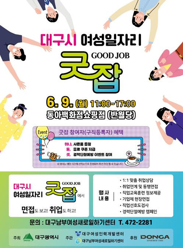 ▸ 현장면접 3개 업체, 간접채용 6개 업체 총42명 채용 예정 [세계타임즈=대구 한윤석 기자] 대구광역시는 취업을 희망하는 경력단절 및 미취업 여성을 위해 ‘찾아가는 여성일자리 ‘굿잡(Good Job)’’행사를 오는 6월 9일(월) 오전 11시부터 동아백화점 쇼핑점(반월당역 15,16,17번 출구)에서 운영한다.