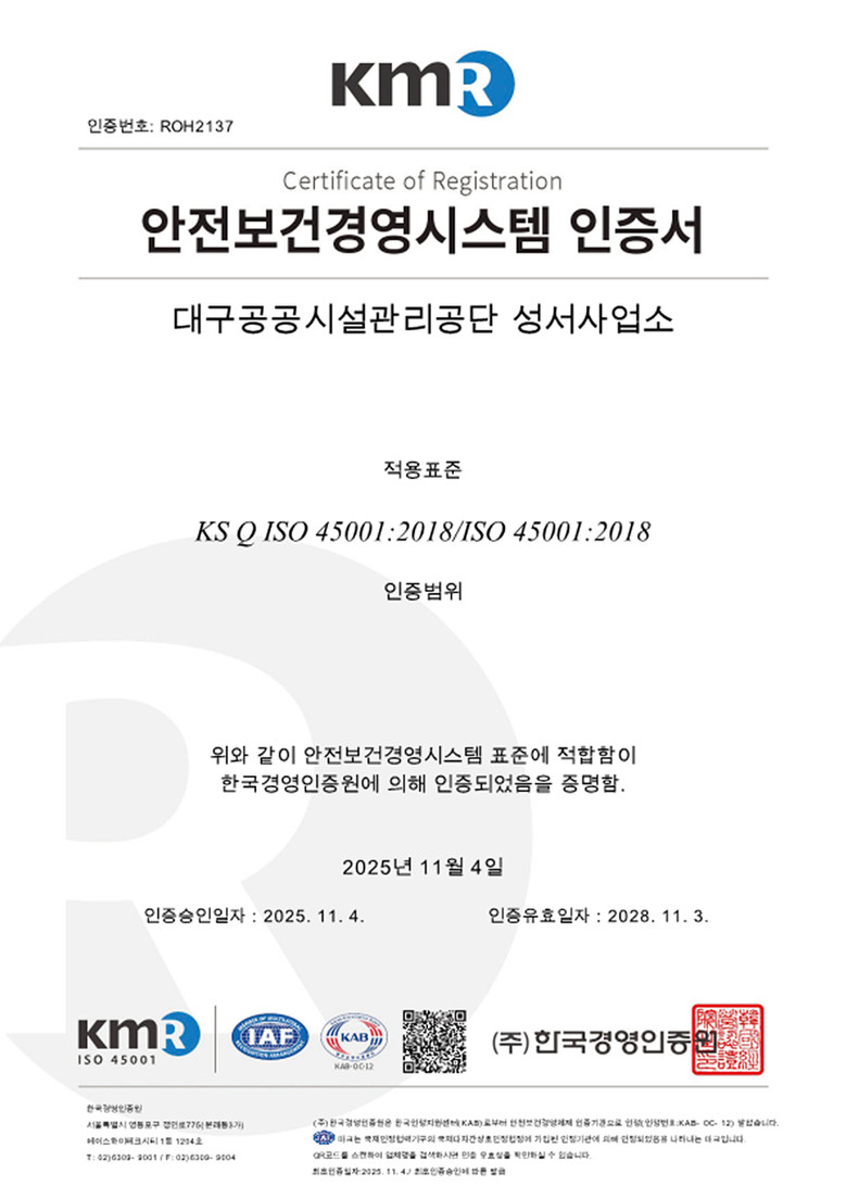 문기봉 대구공공시설관리공단 이사장은 “인증 과정에서 도출된 개선사항을 충실히 반영하고, 모니터링과 내부심사를 통해 안전·보건 수준을 지속적으로 높여가겠다”며, “앞으로도 시민의 안전을 최우선 가치로 삼아 안전경영을 실천해 나가겠다”고 말했다.