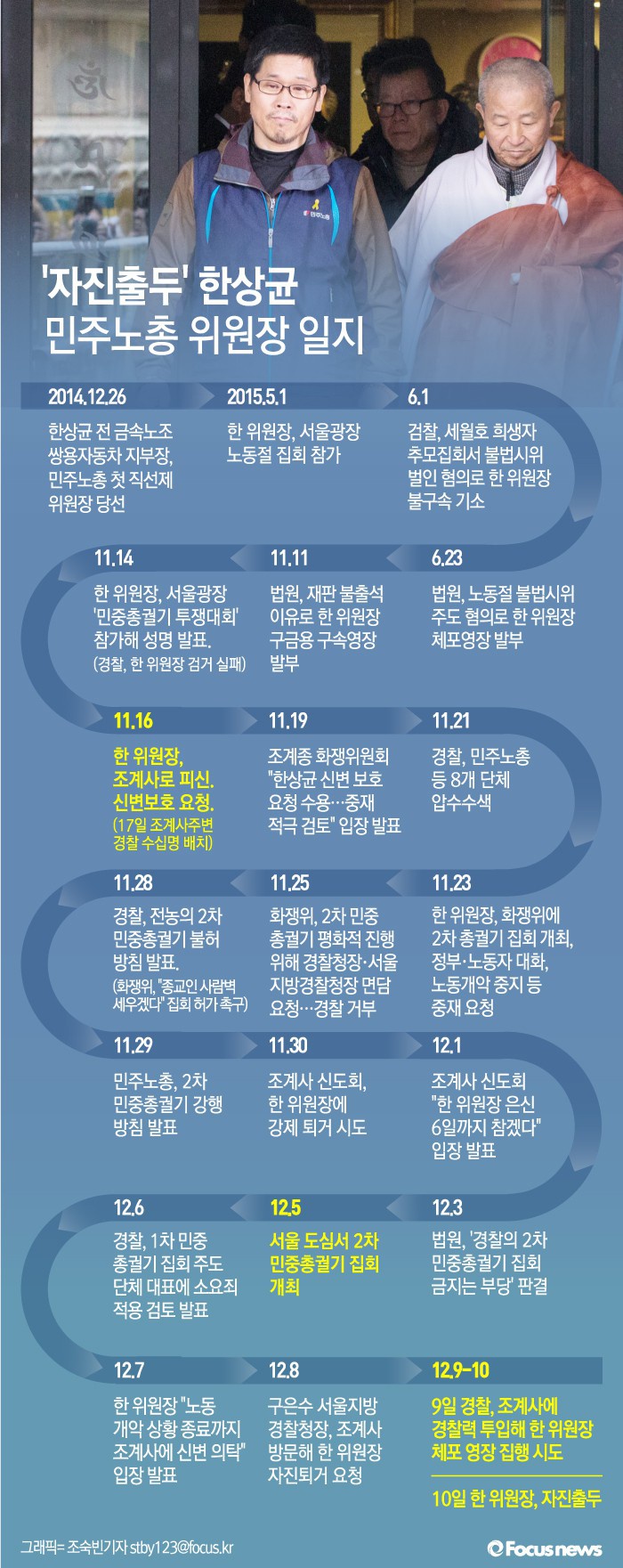 [세계타임즈 이영진 기자] 한상균(53) 전국민주노동조합총연맹 위원장이 10일 오전 은신 중이던 조계사에서 경찰에 자진출석했다.