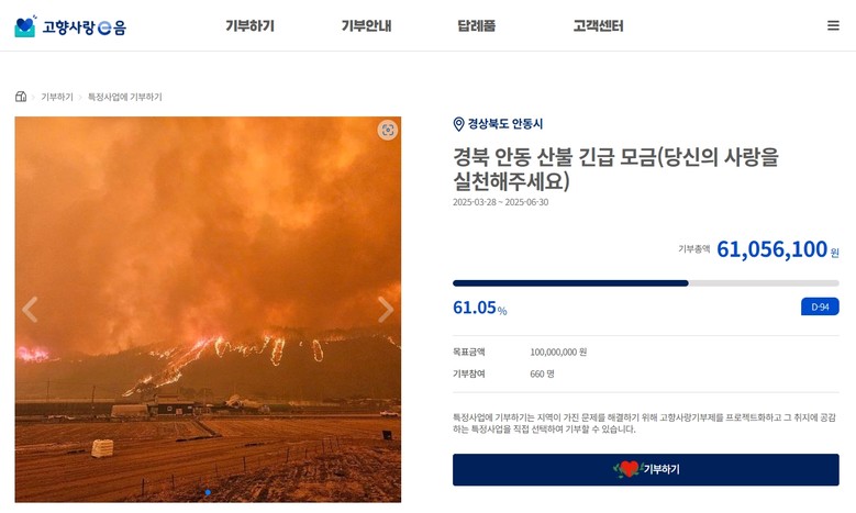 모금 참여는 고향사랑 e음 누리집의 ‘경북 안동 산불 긴급 모금’ (https://ilovegohyang.go.kr/designated-donation/details.html?prjId=2085)에서 즉시 가능하다.