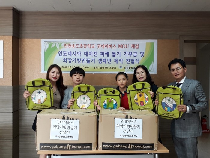 더불어 이번 협약식을 진행함과 동시에 인도네시아 지진피해 주민들을 위하여 굿네이버스 희망가방만들기를 진행함과 동시에 교내 굿마켓(바자회) 운영 및 긴급구호 캠페인 진행을 통해 긴급구호 성금을 조성하여 희망가방 및 기금을 기탁하는 시간을 가졌다. 굿네이버스 인천본부는 인도네시아 지진피해 주민을 위해 교육기관 및 기업, 시민 등을 대상으로 모금활등을 진행하고 있다.