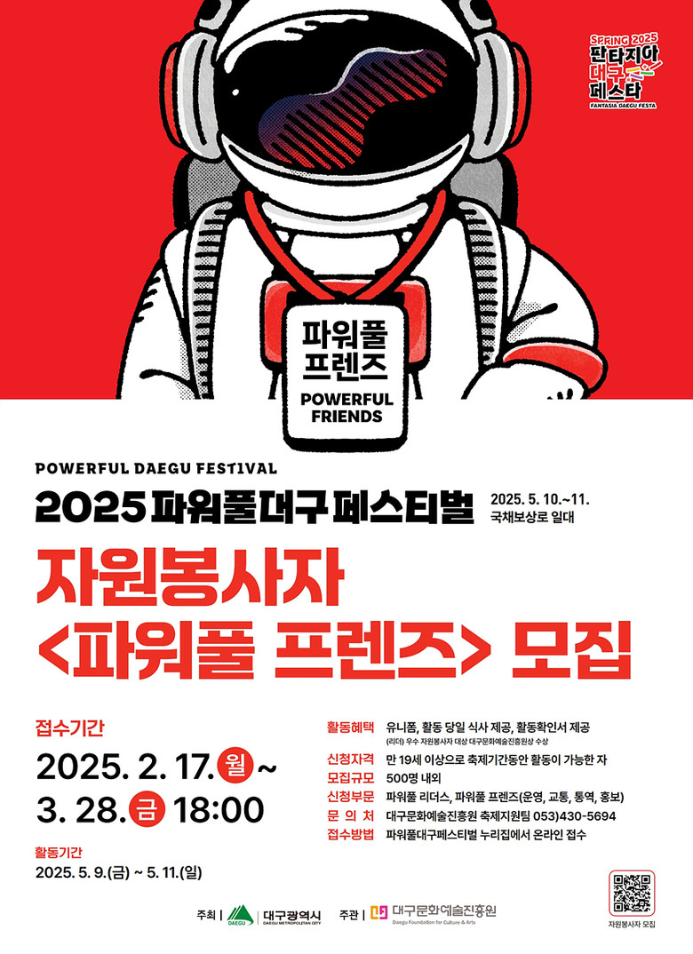 ▸ 리더스, 운영, 홍보, 통역, 교통의 5개 분야로 구성, 만 19세 이상 누구나 신청 가능 [세계타임즈=대구 한윤석 기자] (재)대구문화예술진흥원(원장 박순태, 이하 ‘문예진흥원’)은 2025년 파워풀대구페스티벌의 성공적인 개최를 위해 자원봉사자 ‘파워풀 프렌즈’를 2월 17일(월)부터 3월 28일(금)까지 공개 모집한다.