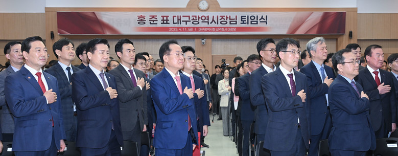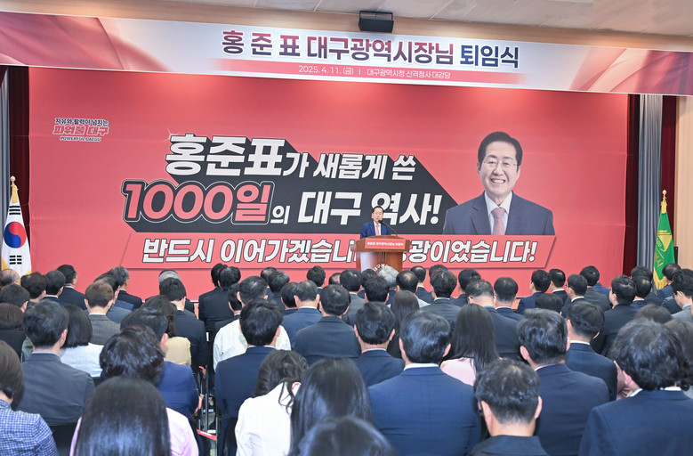 이번 퇴임식은 그간 ‘대구굴기(大邱崛起)’ 실현을 위해 쉼 없이 달려온 홍준표 시장의 담대한 리더십과 헌신적인 열정을 기리고, 시정 혁신의 길에 동참해 온 300여 명의 대구시청 공직자들과 따뜻한 석별의 정을 나누는 감사와 환송의 자리로 마련됐으며, 홍준표 시장의 뜻에 따라 품격은 유지하되, 간소하게 치러졌다.