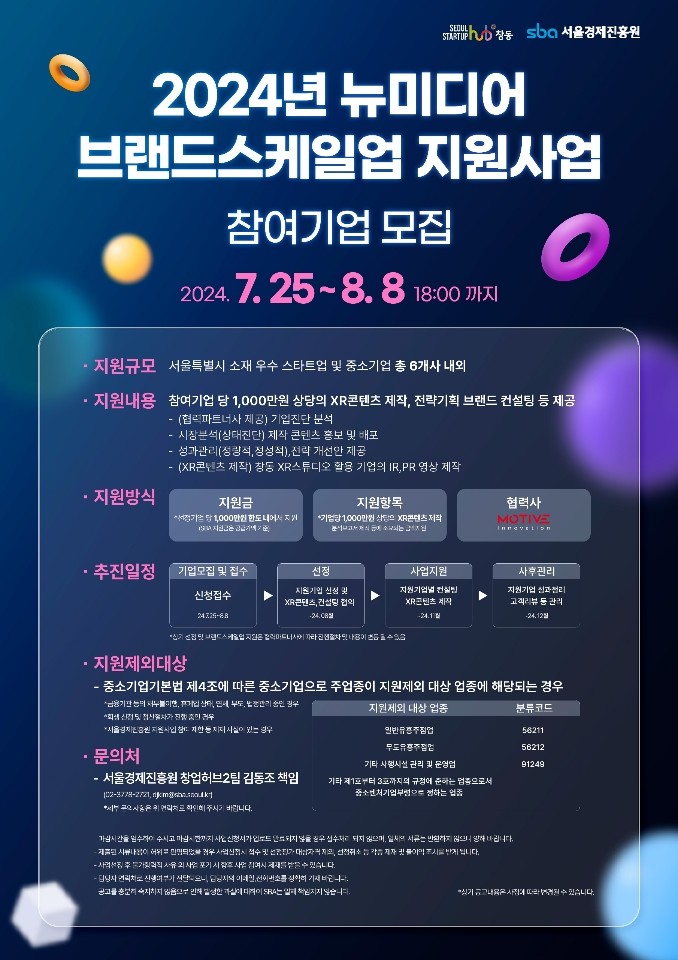 이번 프로그램은 선정된 기업 대상 기업진단/분석 보고서 기반으로 서울창업허브 창동에 구축된 ‘XR스튜디오’를 활용하여 기업PR, IR영상 콘텐츠 및 맞춤형 솔루션 제공으로 기업/브랜드의 인지도를 높일 수 있도록 지원한다.