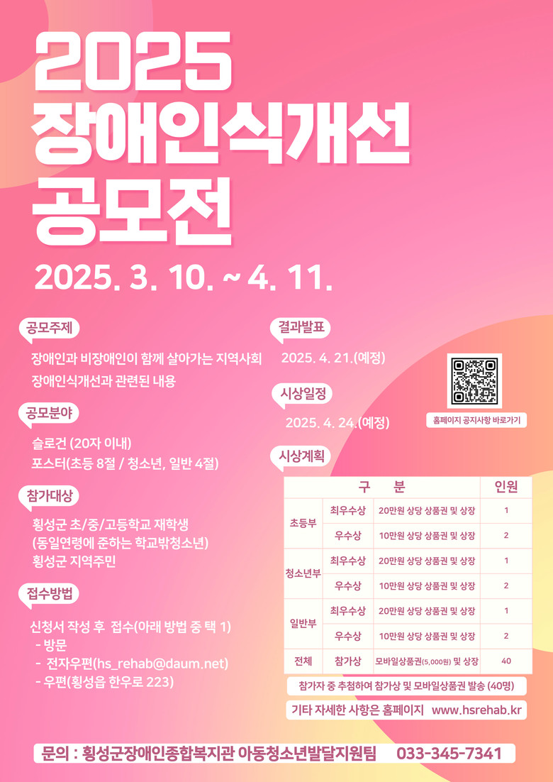 공모전 신청은 방문과 온라인으로 가능하며, 보다 자세한 문의는 횡성군장애인종합복지관 홈페이지 또는 전화(033-345-7341)로 하면 된다.