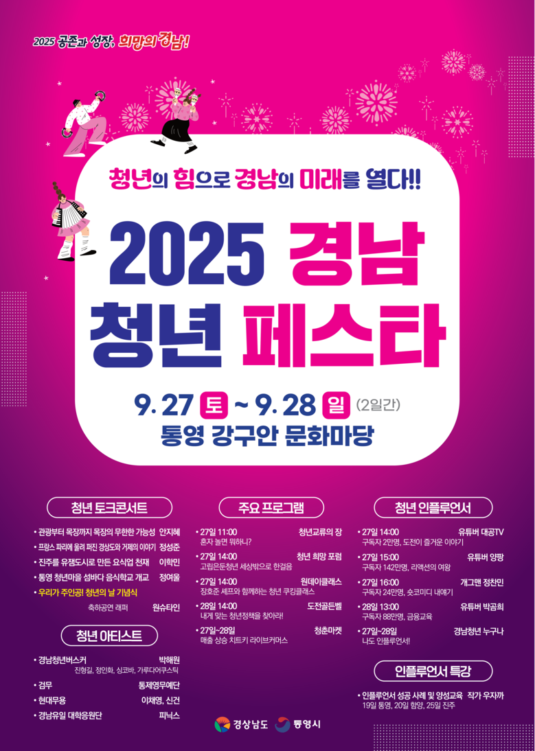 토크 콘서트를 비롯한 경남 청년 페스타의 자세한 정보는 공식 홈페이지(https://2025gyeongnamyouthfesta.com)에서 확인할 수 있다.