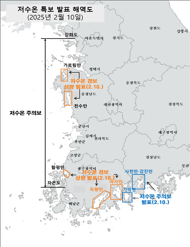 지난달 9일 사천만, 강진만 해역 및 남해・하동군 연안에서 통영 수우도 서단까지 내려졌던 저수온 예비특보가, 이달 들어 강력해진 한파의 영향으로 사천만・강진만 해역에 저수온 주의보로 한 단계 격상돼 발령됐다.