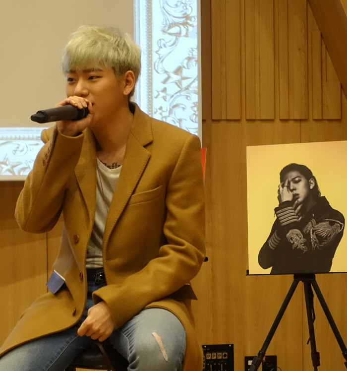 | △ 가수 지코가 7일 오전 서울 이태원 갤러리 스트라디움에서 솔로 첫 미니앨범 ‘갤러리’ 발매 기념 음악감상회를 열고 있다. <사진제공=세븐시즌스> |