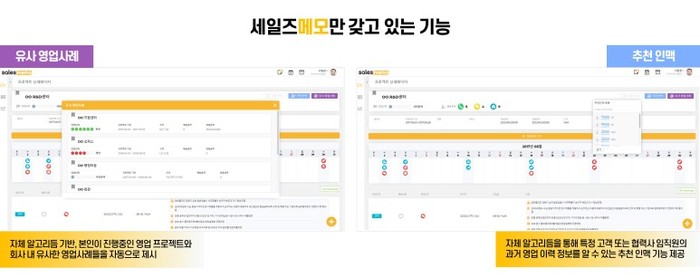 세일즈 메모는 유사 영업 사례, 자체 알고리듬 기반, 본인이 진행 중인 영업 프로젝트와 회사 내 유사한 영업사례들을 자동으로 제시해준다. 추천 인맥, 자체 알고리듬을 통해 특정 고객 또는 협력사 임직원의 과거 영업 이력 정보를 알 수 있는 추천 인맥 기능 제공한다.