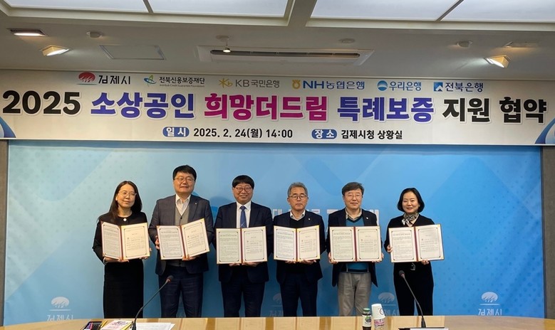 [김제 = 세계타임즈 김서주 기자] 김제시(시장 정성주)는 지난 24일, 장기화된 경기침체로 인해 어려움을 겪는 소상공인의 금융지원을 위해 전북신용보증재단, 금융기관(농협,전북,국민,우리은행)과 희망 더 드림 특례보증 업무 협약을 체결했다고 밝혔다.