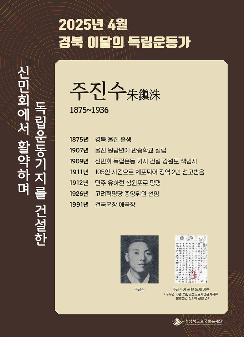 주진수(朱鎭洙, 1875~1936) 선생은 울진 출신으로 1907년 고향 원남면에 만흥학교를 설립하여 청소년들을 대상으로 신교육을 실시하였다. 같은 해 신민회에 참가하였고, 1909년에는 신민회 독립운동 기지 건설을 위한 강원도 책임자로 활동하였다.