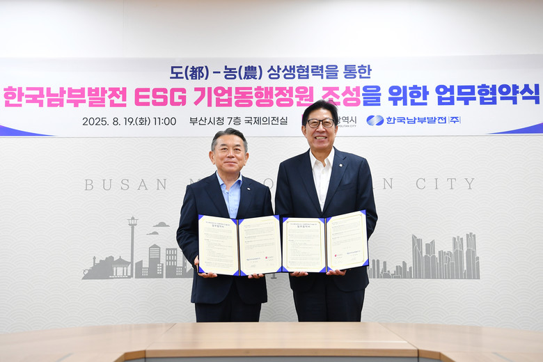 < 업무협약 개요 > ㅇ 일시/장소 : 2025. 8 19.(화) 11:00 / 시청 국제의전실 ㅇ 협약기관 : 부산광역시(시장 박형준), 한국남부발전(주)(사장 김준동) ㅇ 주요내용 - 낙동강 정원 내 ‘사회 가치 경영(ESG) 기업 동행 정원’ 조성 - 정원문화 확산 및 국가정원 지정 추진을 위한 공동사업 발굴·추진 - 사회 가치 경영(ESG) 실천을 통한 지속 가능한 정원 도시 구현 |