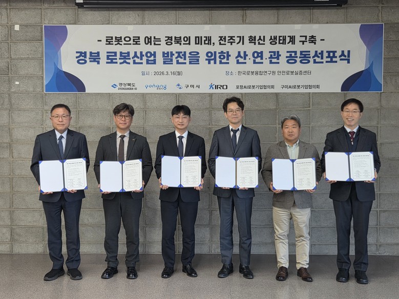경북도는 3월 16일(월) 포항 한국로봇융합연구원 안전로봇실증센터에서 포항시, 구미시, 한국로봇융합연구원(KIRO), 포항AI로봇기업협의회, 구미AI로봇기업협의회 등이 참석한 가운데 ‘경북 로봇산업 발전을 위한 산연관 공동 선포식’을 개최했다고 밝혔다.
