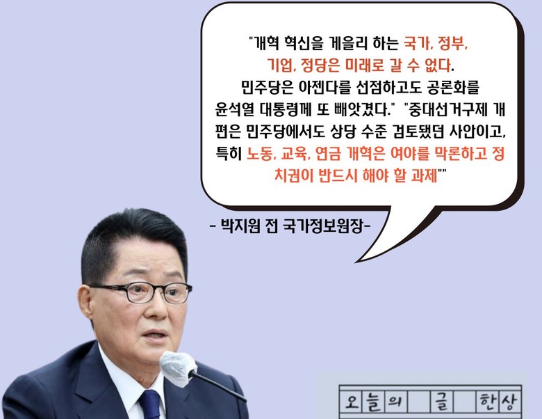 [세계타임즈 백진욱 기자] 최근 박지원 전 국가정보원장이 더불어민주당에 복당하고 중대선거구제를 띄운 윤석열 대통령을 향해 쓴소리를 냈다. 그는 "개혁 혁신을 게을리 하는 국가, 정부, 기업, 정당은 미래로 갈 수 없다"면서 "민주당은 공론화를 윤석열 대통령께 또 빼앗겼다" 고 입을 열었다.