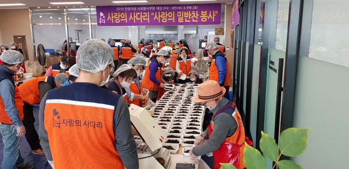 [대전=세계타임즈 이채봉 기자] 대전시 SNS 8천명 봉사단체 사랑의 사다리 밴드(리더 이정제)는 14일 오전9시, 유성구 탑립동 코리아종합안전(대표 송철영)에서 대전시 소외계층 300가정에 사랑의 밑반찬 봉사로 우리 사회의 따뜻한 사랑을 실천 하였다.