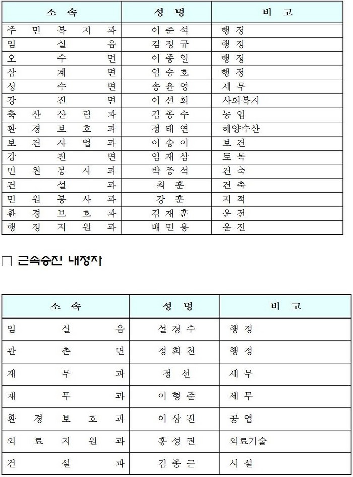 임실군, ˊ18년 상반기 승진인사 내정발령(‘18.1.2.자)