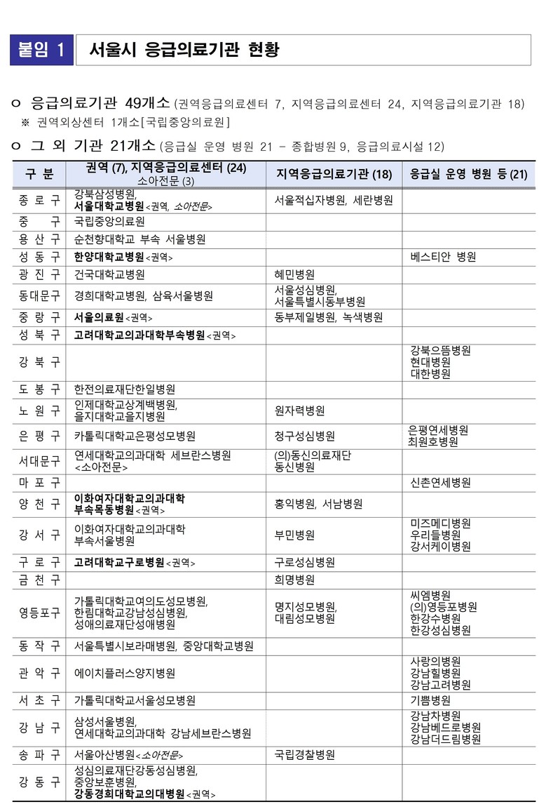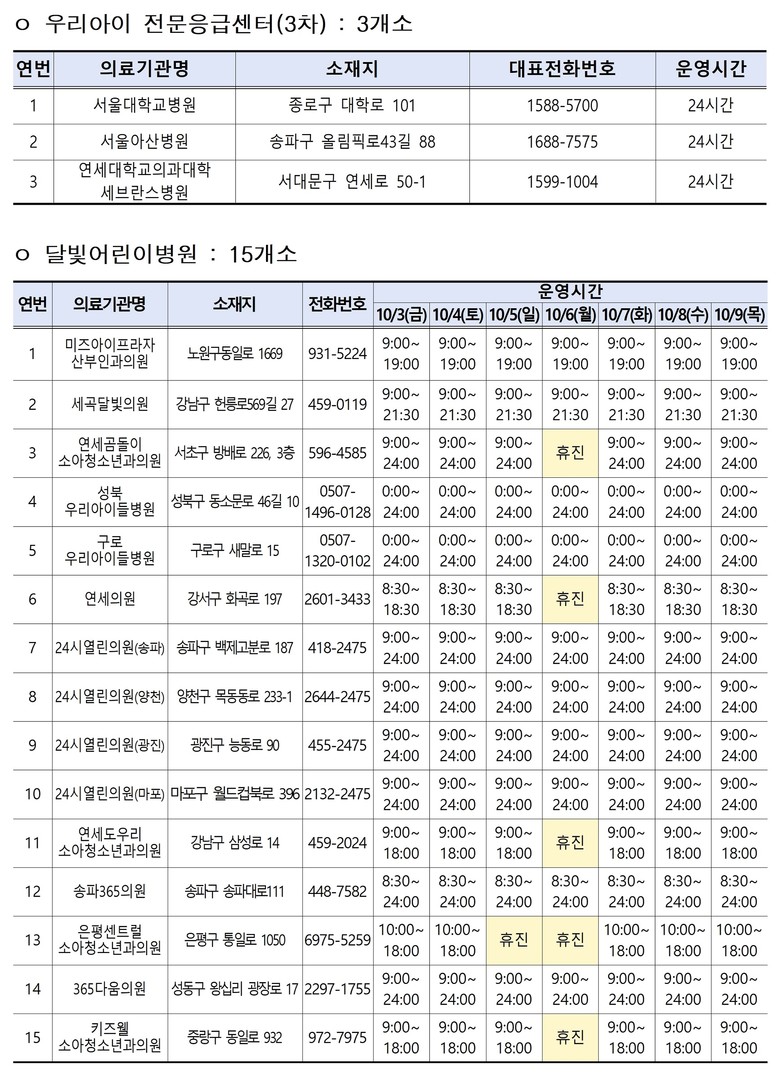 소아 환자를 위한 ‘우리아이 안심병원’ 8개소, ‘우리아이 전문응급센터’ 3개소도 24시간 운영된다. 소아 경증환자의 외래진료는 ‘우리아이 안심의원’ 10개소, ‘달빛어린이병원’ 15개소에서 가능하다.