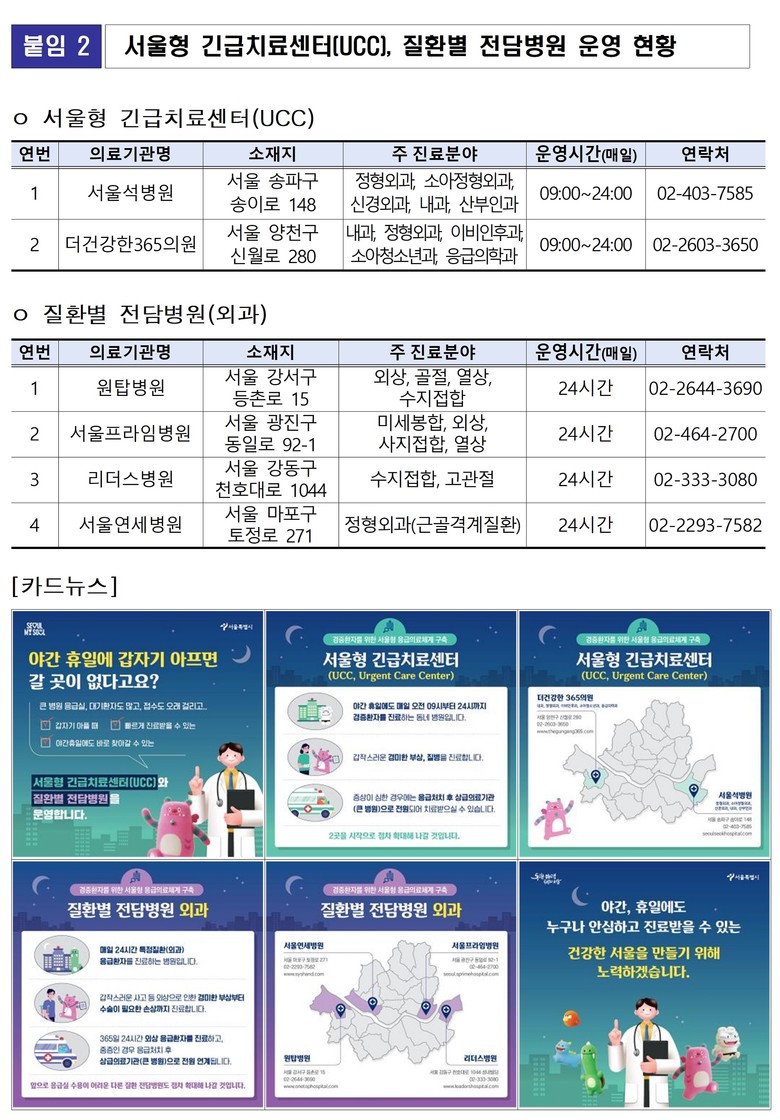 서울형 긴급치료센터는 매일 09시부터 24시까지 외상, 고열 등 급성질환을 진료하고, 질환별 전담병원은 매일 24시간 외과계 응급환자를 진료한다.