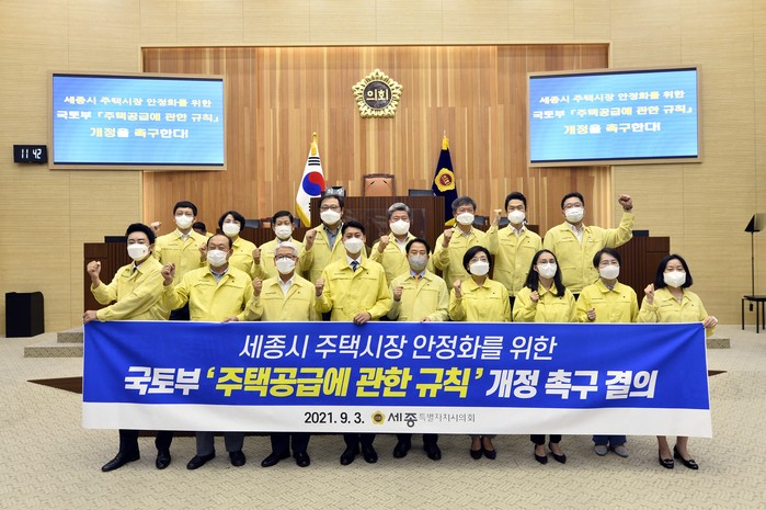 세종시의회는 ‘국토부 주택공급에 관한 규칙 개정 촉구 결의안’을 국회의장과 국토부 장관, 행정중심복합도시건설청 등에 이송할 예정이다.