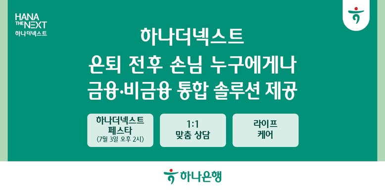 하나은행 관계자는 “누구에게나 찾아오는 은퇴와 노후를 쉽고 편리하게 준비할 수 있도록 문턱을 낮춘 최적의 솔루션이 바로 하나더넥스트다”며, “시니어 손님의 인생 여정에 발맞추어 전문적인 금융 솔루션과 함께 풍요로운 노후 생활을 완성 할 수 있는 유익한 서비스 제공에 최선의 노력을 다하겠다”고 밝혔다.