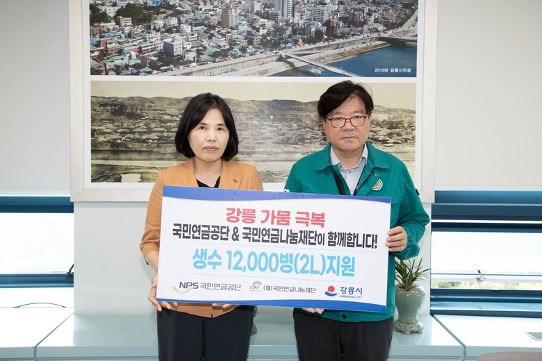 [세계타임즈 = 이영진 기자] 국민연금공단(이사장 김태현)과 국민연금나눔재단(이사장 강흥구)은 최근 극심한 가뭄으로 재난사태가 선포된 강릉시(시장 김홍규)에 5일 2리터 생수 12,000병을 긴급 지원했다.