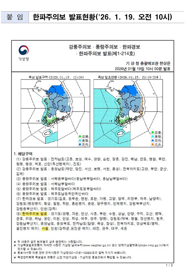 - 19일(월) 밤 9시 기준 서울 전역 한파주의보… 영하 10도 이하 강추위 지속