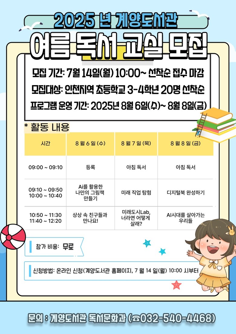 참가 신청은 7월 14일(월)부터 계양도서관 누리집에서 선착순 접수하며, 자세한 사항은 계양도서관 누리집(https://lib.ice.go.kr/gyeyang)을 참고하거나 어린이자료실(☎032-540-4468~9)로 문의하면 된다.