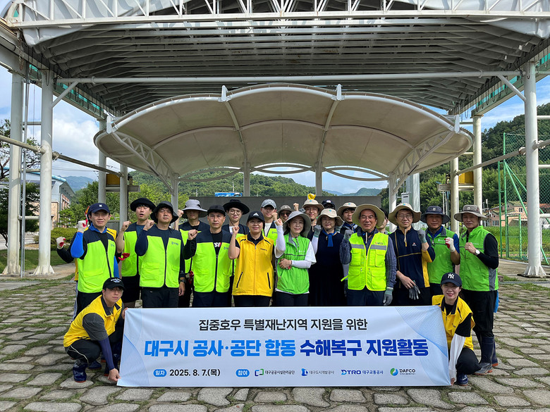 이번 봉사활동에는 대구공공시설관리공단, 대구도시개발공사, 대구교통공사, 대구농수산물유통관리공사 소속 임직원 각 5명씩 총 20명이 참여해 침수 가구 주변 정비 및 토사 제거 등 복구 작업에 힘을 보탰다.