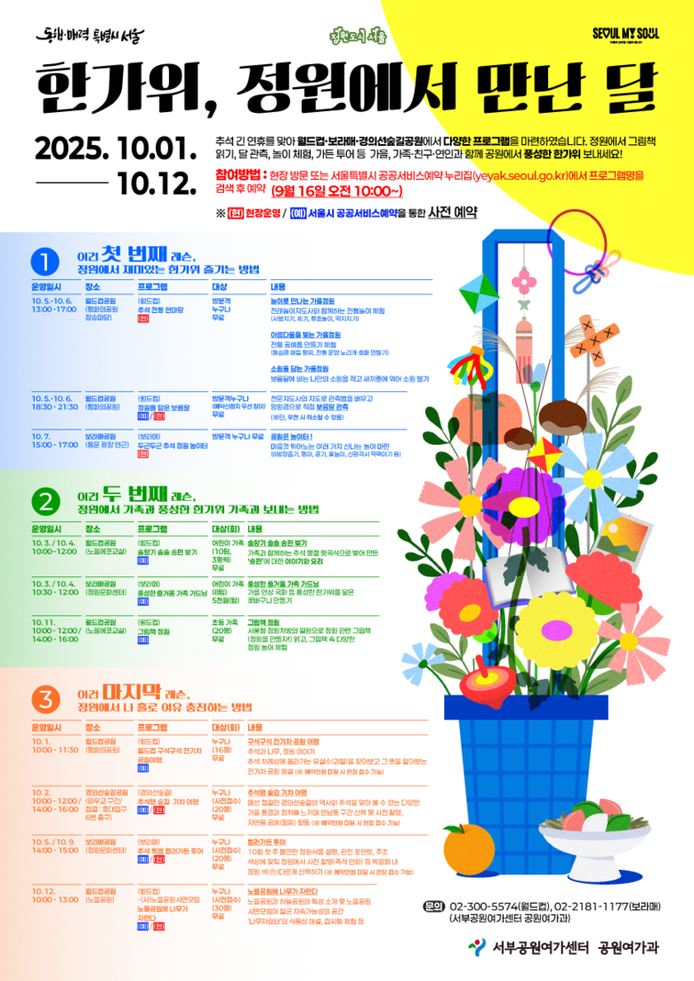 <보라매 풍성한 즐거움 가족 가드닝>은 보라매공원 정원문화센터에서 가족과 함께 가을 연상 국화 등 풍성한 한가위를 닮은 꽃바구니를 만들어보는 가드닝 체험 프로그램으로 10월 3일~4일 동안 운영한다.(참가비: 5,000원, 온라인 선착순 접수, 가족·팀 단위 모집)