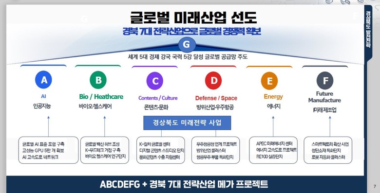 새정부는 신성장 전략으로 ABCDEF[AI(인공지능), Bio(바이오), Contents(문화콘텐츠), Defense(방산), Energy(수소+이차전지), Future Manufacturing(미래 제조)]를 제시한 바 있다. 이는 경북이 강점을 가지고 지속적으로 강조해온 AI, 바이오, 방산, 수소, 이차전지, 반도체 산업 등과 일치한다. 이에 따라 경북은 새정부 기조에 주력산업의 글로벌화(Global)를 더한 ‘경북형 ABCDEFG ’ 전략을 적극적으로 추진할 계획이다.