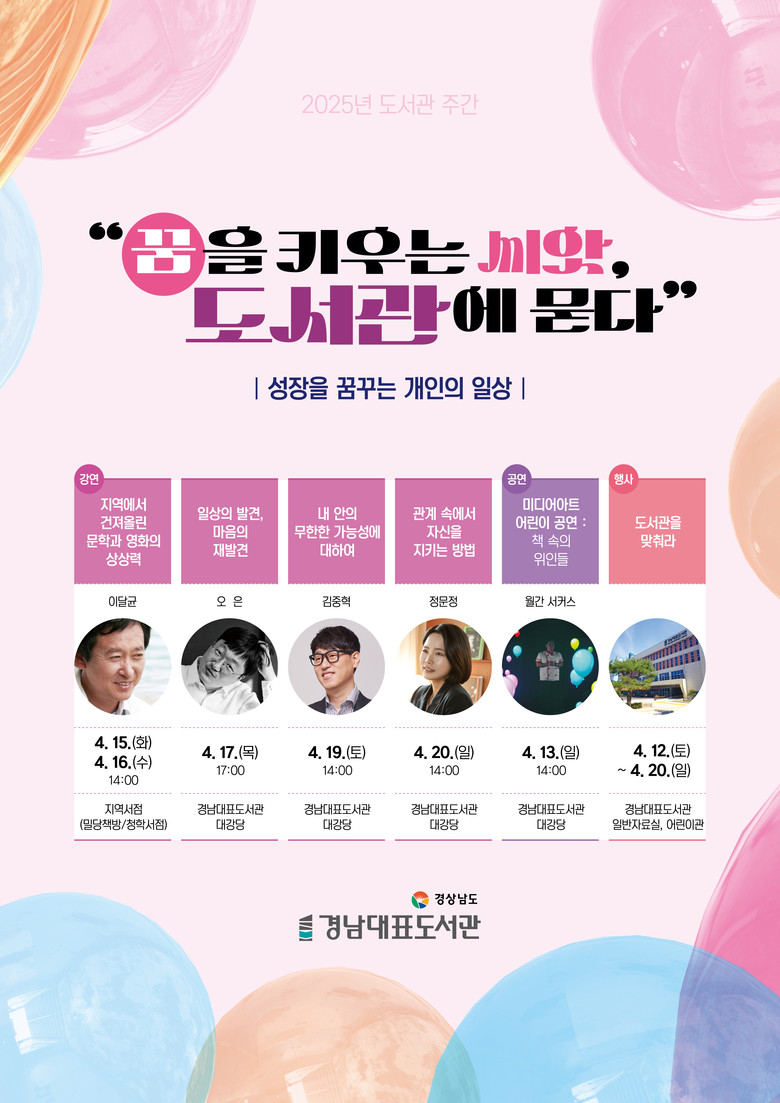 경남대표도서관은 이번 도서관주간 주제를 시대적 흐름에 맞춘 ‘성장을 꿈꾸는 개인의 일상’이라는 테마로 정하고 ▵강연 4 ▵강좌 1 ▵공연 1 ▵행사 2 ▵전시 1 등 총 9개 행사를 진행한다.