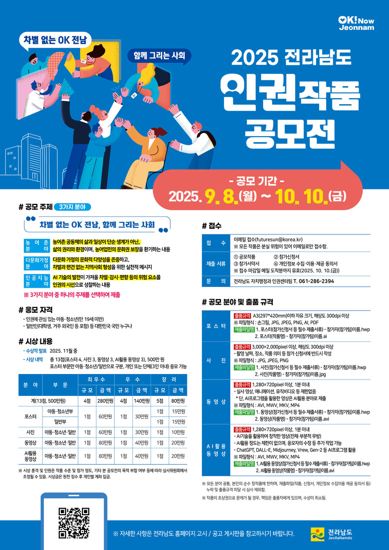 공모는 ‘차별 없는 OK 전남, 함께 그리는 사회’로, 농어촌, 다문화, 디지털 인권(AI) 등 전남의 현실과 시대적 흐름을 반영한 3대 주제를 중심으로 진행된다.